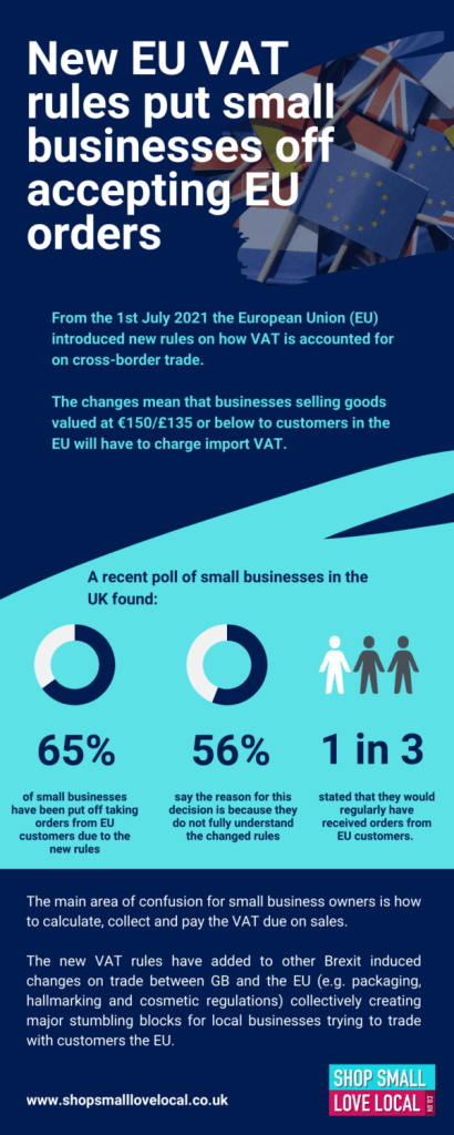 A recent poll of small businesses in the UK, by Shop Small, Love Local, showed that as a result of the new rules 65% of small business owners have been put off taking orders from EU customers. For 56% the reason for this decision was because they did not fully understand the changed rules. A further 22% were worried about the cost implications for their business.