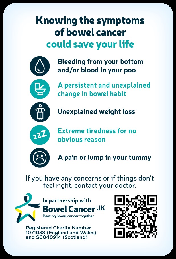 “Bowel cancer is treatable and curable especially if diagnosed early, but 60% of people are diagnosed at later stages when it is much more difficult to treat. Part of the problem is low awareness of the red flag symptoms of bowel cancer that should prompt people to contact their GP.