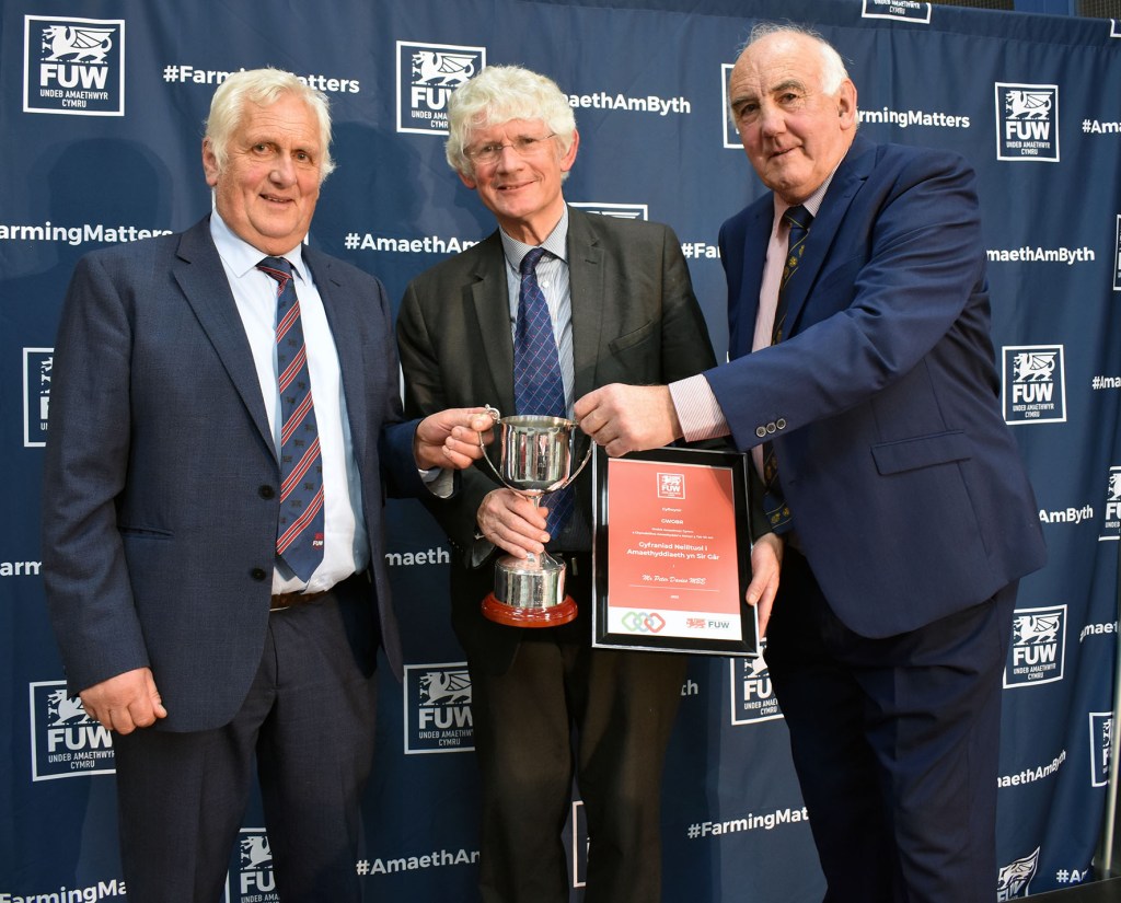 The Farmers’ Union of Wales – United Counties Agricultural and Hunters Society Award has been presented to long serving member of staff and former FUW Facilities and General Administration Manager Peter Davies.