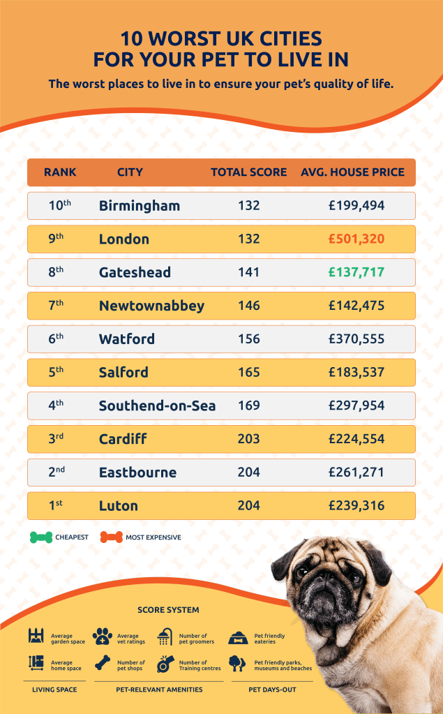 For the overall UK rankings, Bridgend (Wales), ranks just shy of 1st place, placing as 2nd best as most inviting to four-legged neighbours. The South Wales town offers both prospective buyers and pet owners alike the most affordable option among the UK’s top 10 pet-friendly places to live, with property prices averaging at £167,325