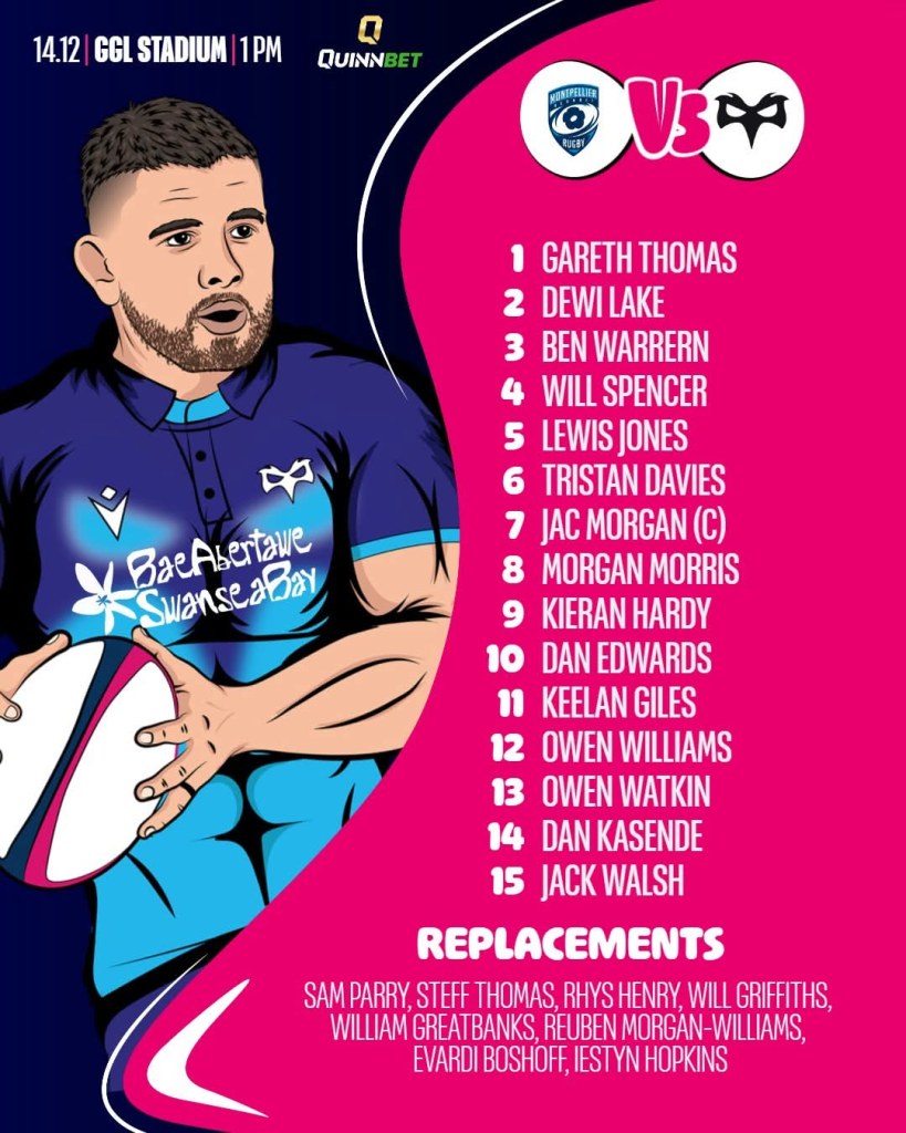 1. Gareth Thomas, 2. Dewi Lake, 3. Ben Warren, 4. Will Spencer, 5. Lewis Jones, 6. Tristan Davies, 7. Jac Morgan (captain), 8. Morgan Morris.