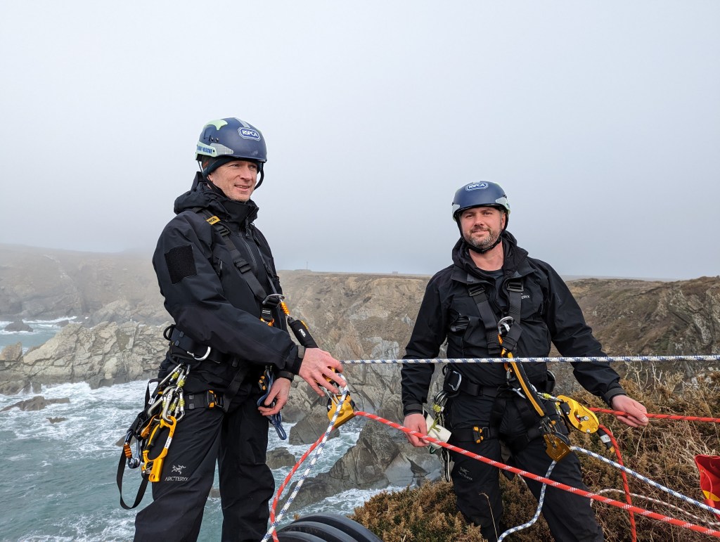 The animal welfare charity was contacted by a farmer, who had made an unsuccessful attempt to reach the two ewes who had strayed down the cliffside close to the coastal footpath at Deadman’s Bay near to Skomer Island.