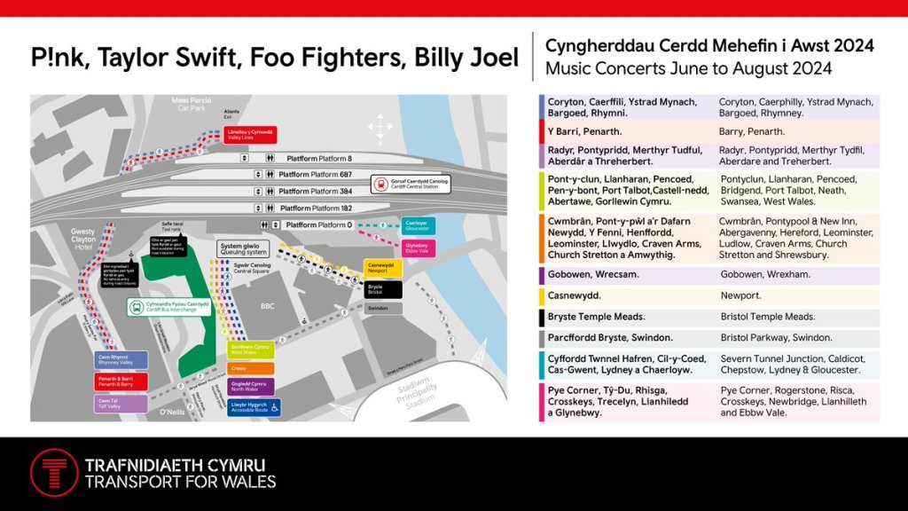 In total, on each of the concert nights, five services will run to Swansea from 10.52pm, with 11 services to Newport travelling on to either Bristol Temple Meads, Bristol Parkway and Swindon from 10.30pm.