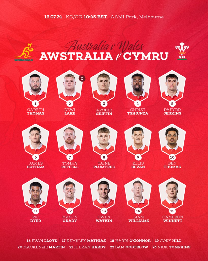 Cameron Winnett, Liam Williams, Owen Watkin, Mason Grady, Rio Dyer; Ben Thomas, Ellis Bevan, Gareth Thomas, Dewi Lake (captain), Archie Griffin, Christ Tshiunza, Dafydd Jenkins, James Botham, Tommy Reffell, Taine Plumtree.