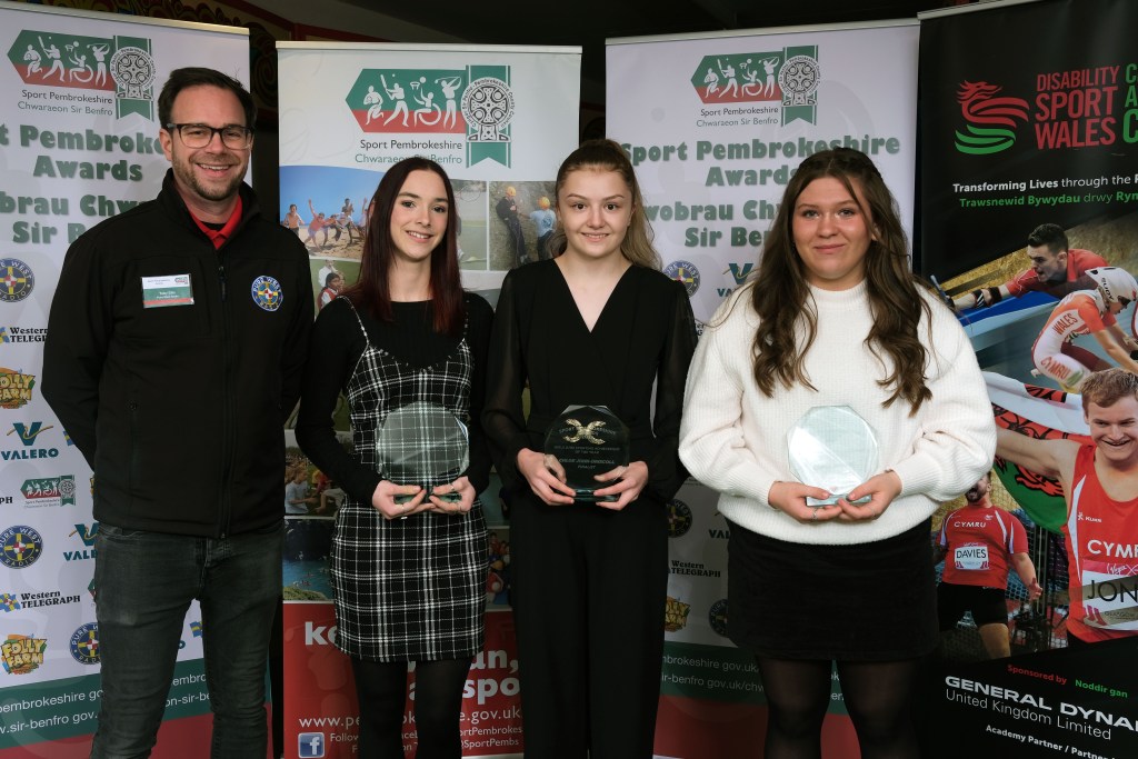 Pictured is winner Heather Lewis with finalists Ashleigh Barnikel and Ysie White and Matt Freeman of Sport Pembrokeshire.