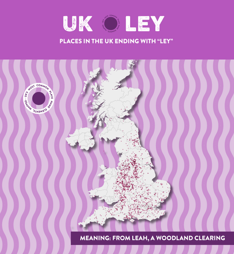 Deriving also from the Old English of the Anglo-Saxons, places featuring “ley” are widespread across several of the former Anglo-Saxon kingdoms that came before England existed. Meaning a woodland clearing, there are once again large clusters in the West Midlands, where several large woodlands still stand today, including the National Forest, which covers 200 square miles.