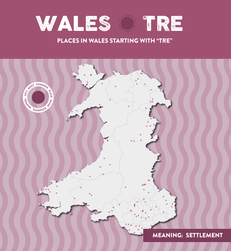 Meaning settlement, “tre” can be found in place names in a few key pockets of Wales. The first is in Glamorgan, a former Welsh kingdom which was much contested with the English. There is also a high concentration of places beginning with “tre” in the St Davids area of Pembrokeshire, which was once one of the highest populated areas in Wales, due to its importance in the Christian community throughout the medieval period.