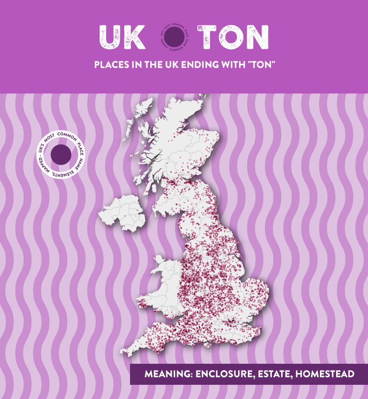 With a wide variety of meanings including enclosure, estate, homestead, and farm, it’s no surprise that “ton” is the most popular place name element in the UK. “Ton” comes from the Old English spoken by the Anglo Saxons, who first arrived in Britain during the 6th century and established the foundations of the English language as we know it. A large number of places featuring “ton” can be seen on the map in the Midlands and the Welsh Borders, where Mercia, one of the largest Anglo-Saxon kingdoms, once was.