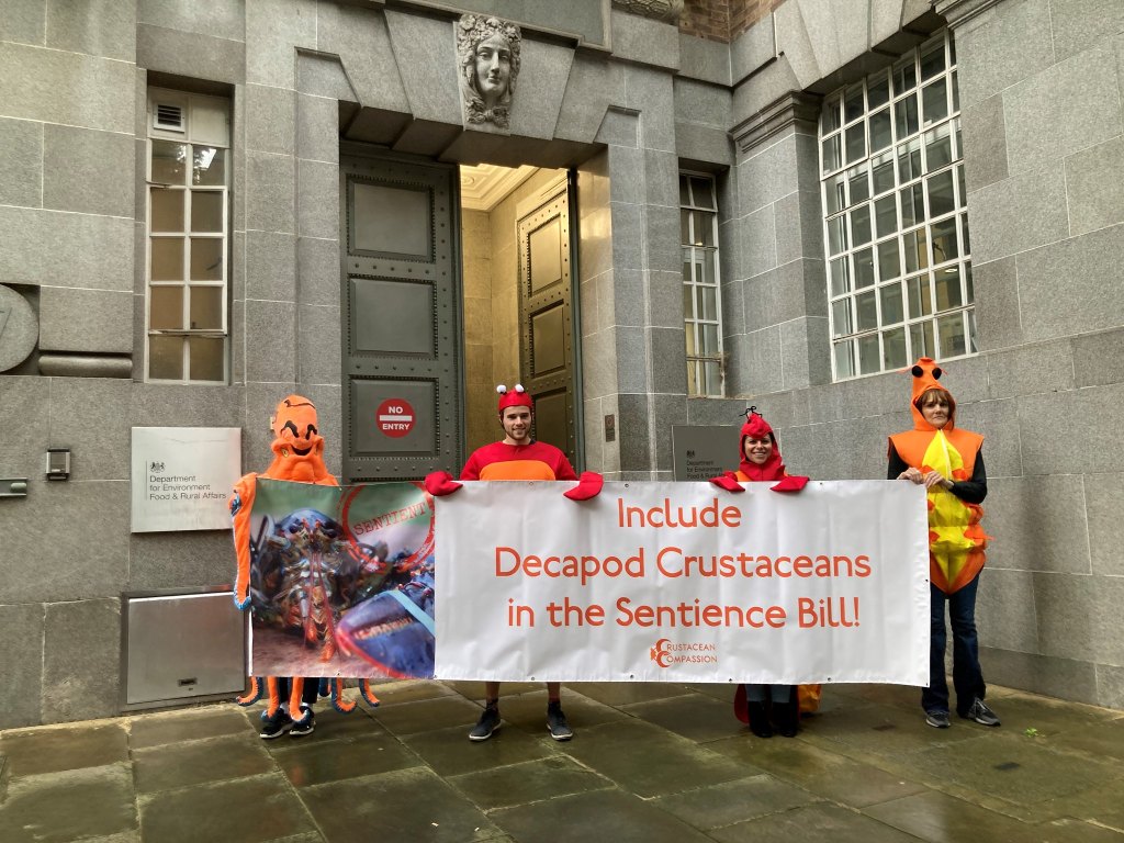 Snappily dressed shellfish campaigners gathered outside the House of Lords today as Peers put forward amendments to the Animal Welfare (Sentience) Bill to recognise that crabs and lobsters can feel pain.
