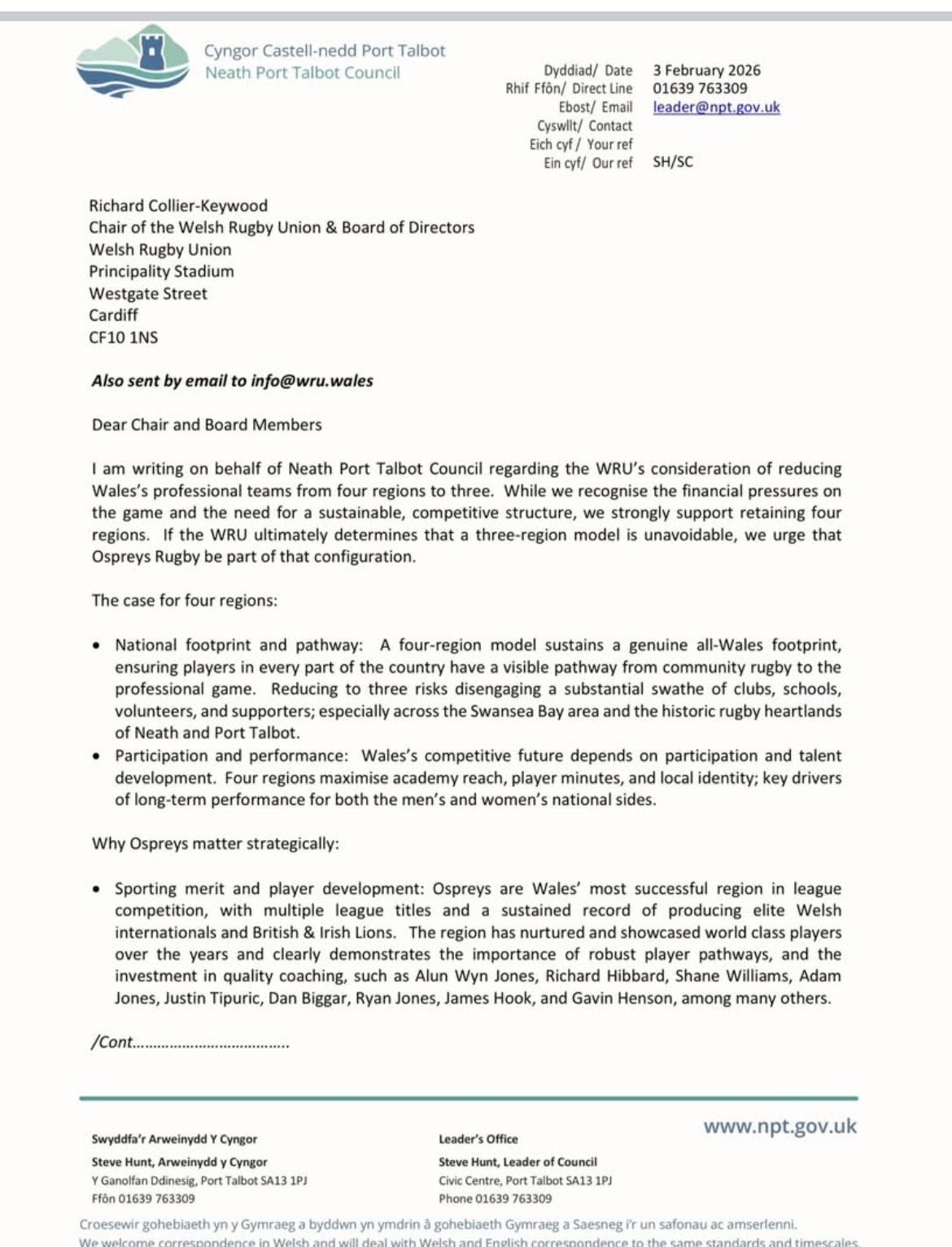 Cllr Steve Hunt has written directly to WRU chair Richard Collier‑Keywood and the Board as the union continues to consider slashing Wales’ professional teams from four to three — a move that could leave the Ospreys fighting for survival.