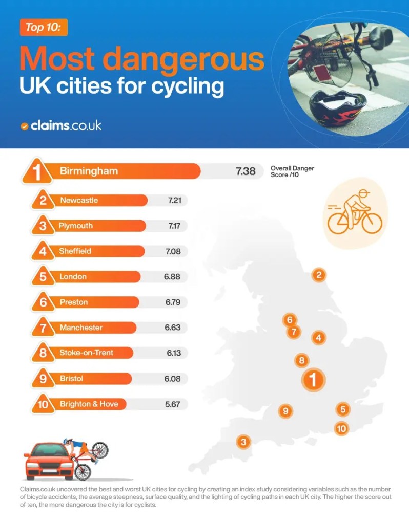 Claims.co.uk also revealed that Birmingham is the most dangerous for cycling, as the city racks up an overall danger score of 7.38/10. Bikers are most likely to suffer from poorly-maintained road surfaces (9/10), and steep pathways where less than 50% are equipped with optimal lighting. These could thus contribute to the city’s bike accident score of 6.75/10.