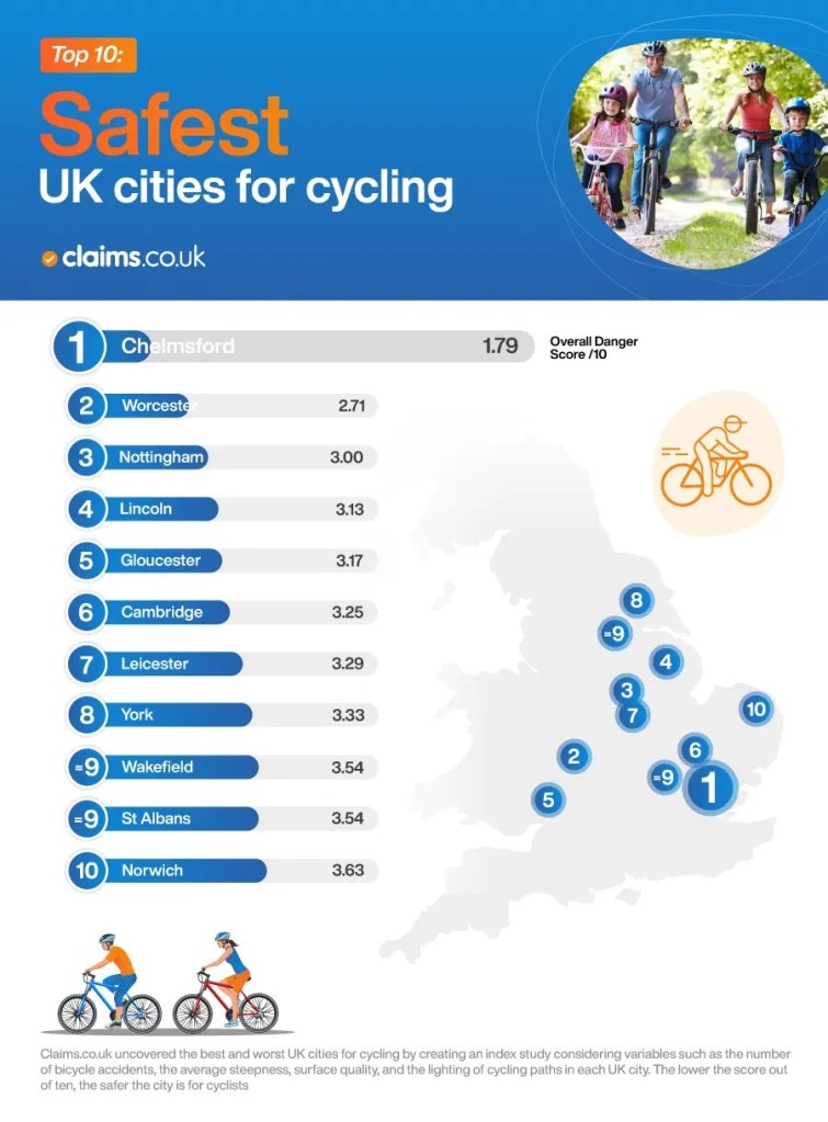 Chelmsford was crowned the most bike-friendly UK city.