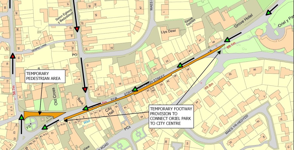 The new system will see High Street become one-way from Oriel y Parc (the Pembrokeshire Coast National Park visitor centre) to Cross Square. This will allow the footway along the whole route to be considerably widened and marked using traffic cones.