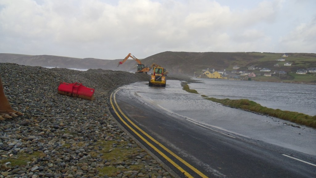 Newgale beach’s shingle bank has been breached many times. Passengers had to be rescued after a bus was hit by a large wave there during storms in February 2014. There is concern the road could be lost eventually to the sea.