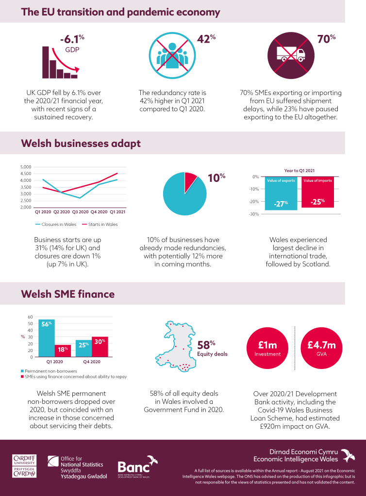 The effects of Covid-19 and the initial post-Brexit trade agreement period on the Welsh economy have been tracked as part of Economic Intelligence Wales’ (EIW) annual report on the performance of the Welsh economy in 2020/21.
