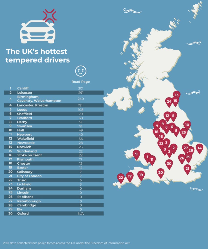 Cardiff topped the list, with 301 instances of drivers ranting at other road users in the city, followed by Leicester at 291.
