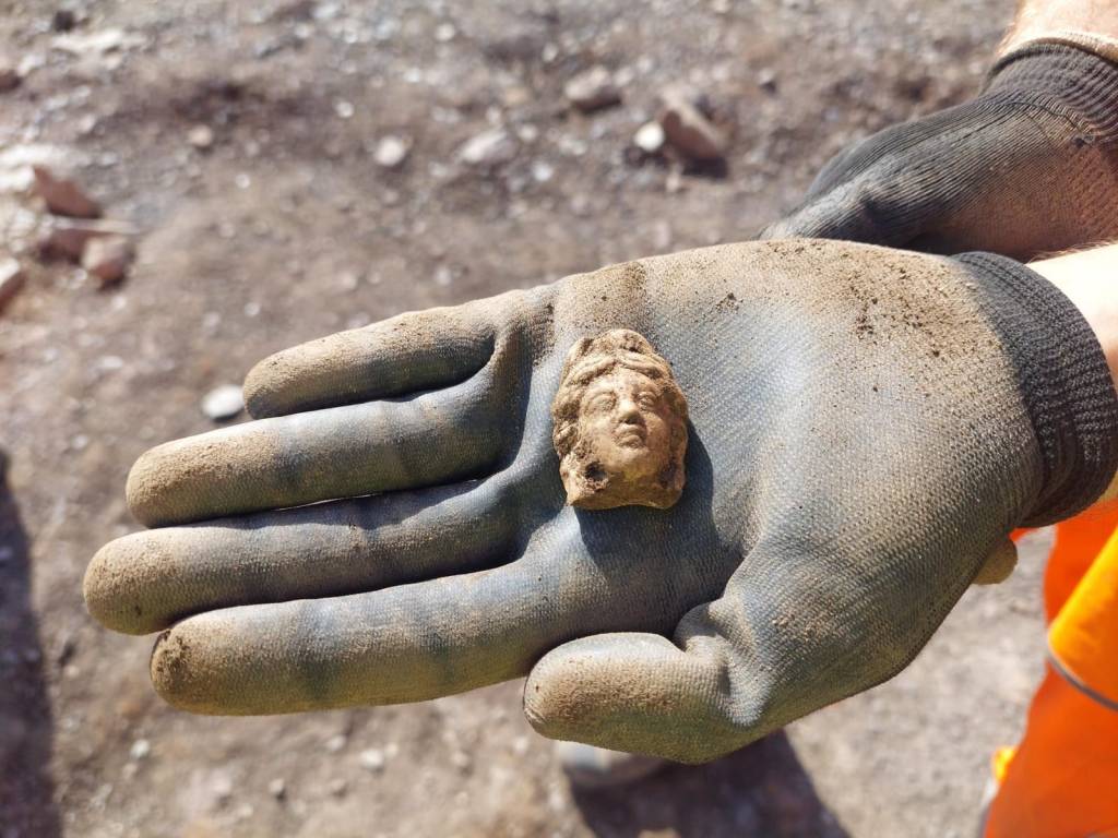 Among the finds are brooches, glass beads, a bone hair pin, and a lamp holder described as being in “terrific condition”. A finely crafted figurine head, believed to have been part of a household shrine known as a lararium, was also recovered.