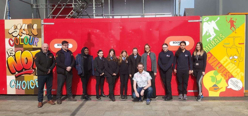 Bouygues UK’s Nick Toulson and Hadley Hands gave the pupils a site tour, allowing them a chance to see the construction in progress and look at the murals, which respond to issues the children feel strongly about like racism and hate crime, on the board hoardings.