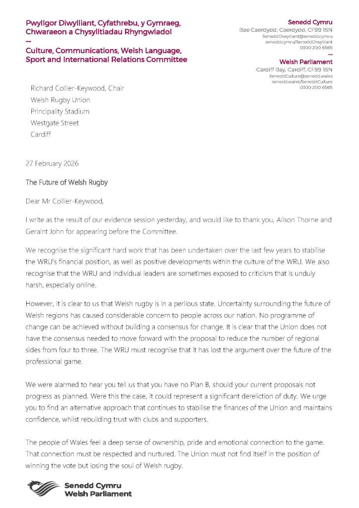 The committee’s letter, signed by Chair Delyth Jewell MS, states that Welsh rugby is in a “perilous state” and that the WRU’s proposals have caused “considerable concern to people across our nation.”