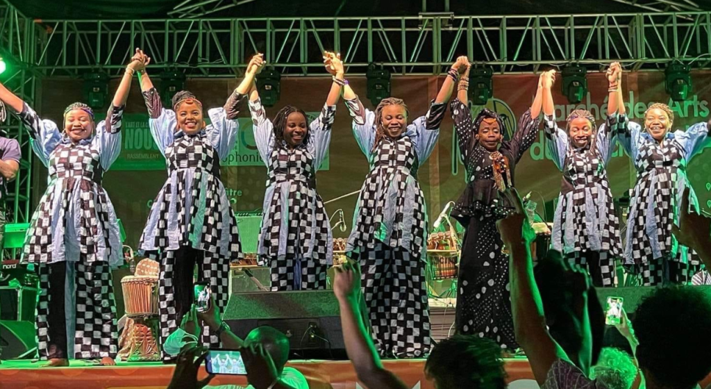 At a very young age she learned her craft at her father’s (Ousmane Kouyaté, balafon master) side, and grew up immersed in ancient musical tradition forming her own unparalleled musical versatility and artistic ingenuity. In turn she has passed this most precious heritage to her eight children (five daughters and three sons), with whom she shares the stage and her passion for traditional instruments. Djeliguinet’s determination and talent has seen her ascend to be a respected artist in the male dominated music scene of West Africa, breaking barriers and shattering stereotypes, paving the way for her all-woman family super-group Djeliguinet et ses Enfants (Djeliguinet and her children) featuring her sister and four of her daughters.