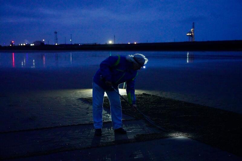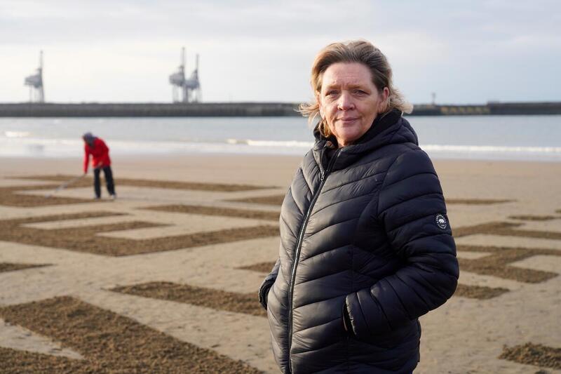 The artwork, created by the arts organisation ‘Sand In Your Eye’, took several hours to draw out in the sand overnight, working in total darkness. Four Welsh Greenpeace activists helped to rake the sand and put the finishing touches on the artwork, including the tattoo on Nessa’s arm that translates from Welsh as ‘hearts of steel’.