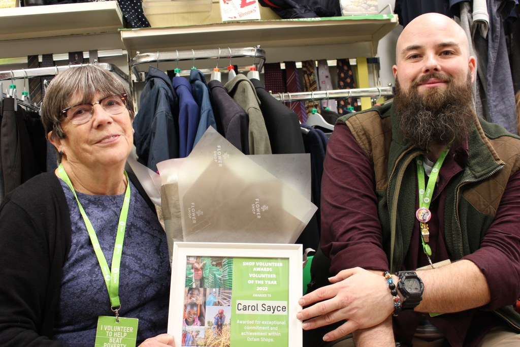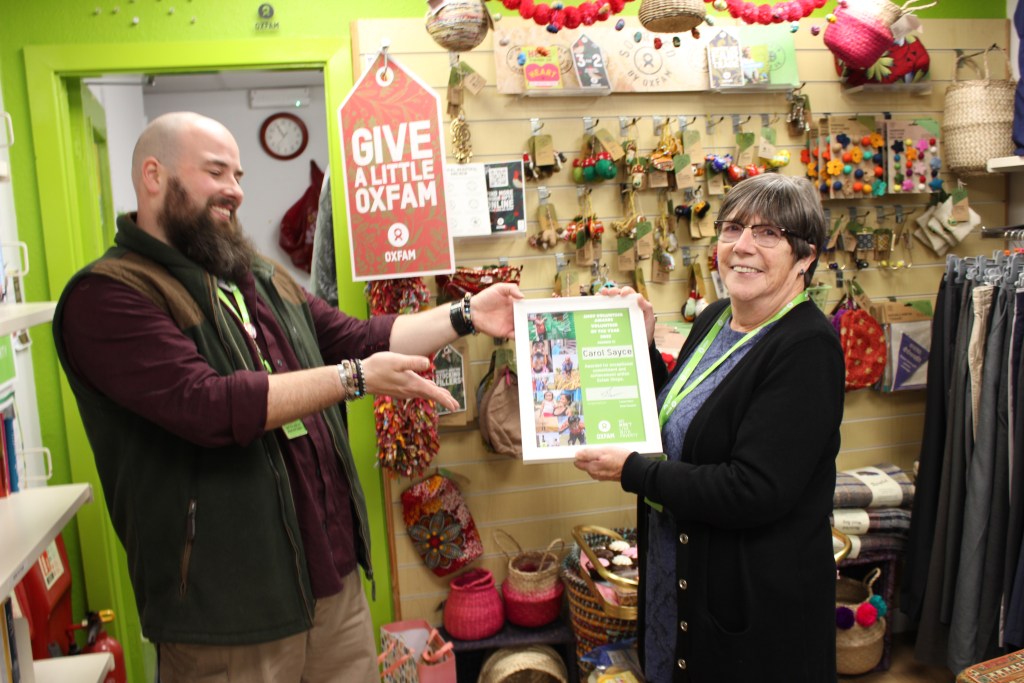 Carol Sayce is the lead volunteer at Oxfam’s Swansea shop, and has supported the shop and those who work and volunteer there for over eight years, including through difficult periods such as pandemic lockdowns.