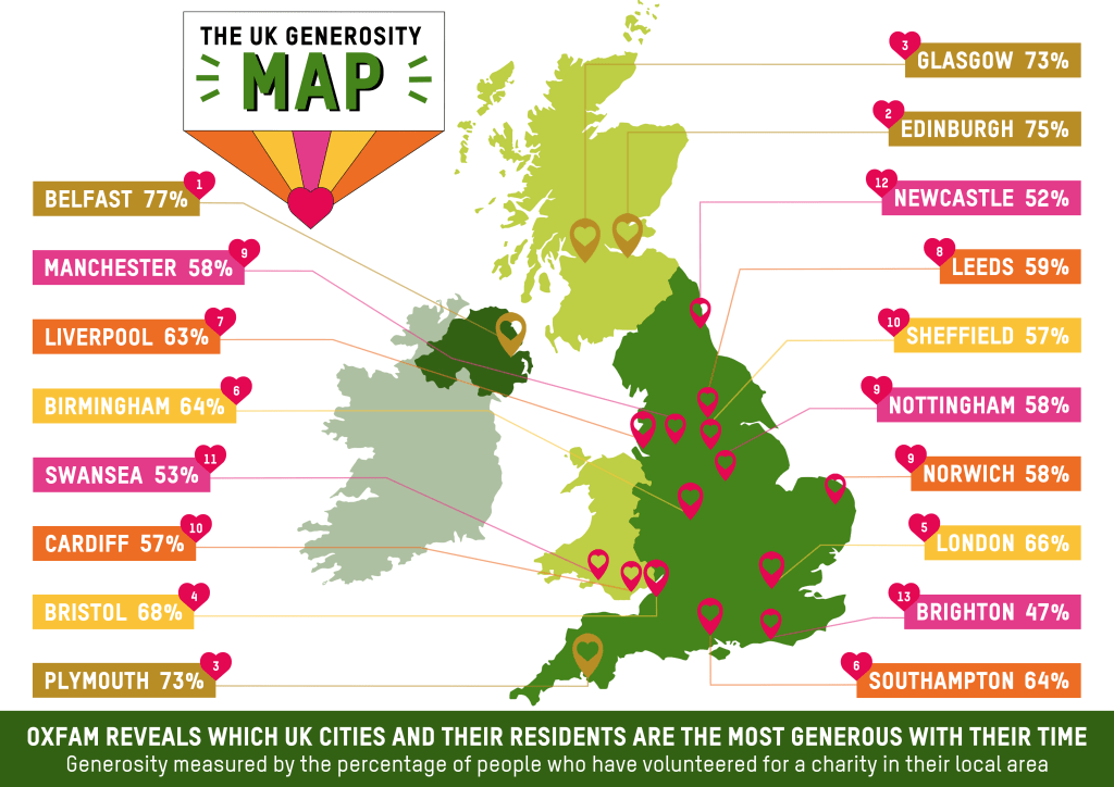 The full breakdown of UK cities, ranked by the percentage of people who have volunteered to charity, includes:
