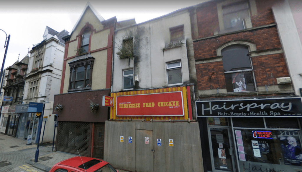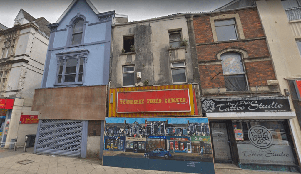 In 2008, street view images shows one of the shops looking like it’s already been empty for some time. The upper floors are boarded up and bushes sprout from the building. A shop sign above hints that Tennessee Fried Chicken was once served here, but the shop front is boarded up, and ominous signs tell people to keep out.