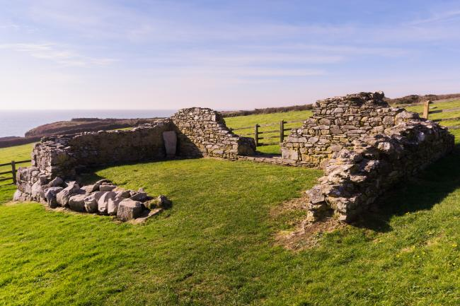 St Non’s ruined medieval chapel lies on a spectacular and remote part of the Wales Coast Path in North Pembrokeshire, where she is said to have given birth to St David. Labour pains caused her to grip a stone so hard that her fingerprints were left on it, splitting it in two.