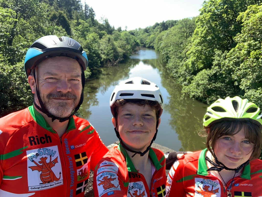 Mostyn Carthew (pictured above centre with dad Richard and sister Isobel), who was cared for on the ward before a bone marrow transplant in 2018, undertook a 360-mile sponsored cycle between two places bearing his name – Mostyn in North Wales and Carthew in Cornwall – in order to thank Morriston hospital staff for his care.